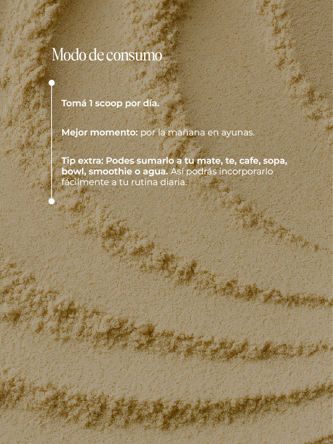 Tomá 1 por día. Mejor momento: por la mañana, en ayunas, con un vaso de agua. Tip extra: sumalo a tu mate, te, cafe, bowls, smoothies o botella de agua para sumarlo fácil y rápido a tu rutina diaria.