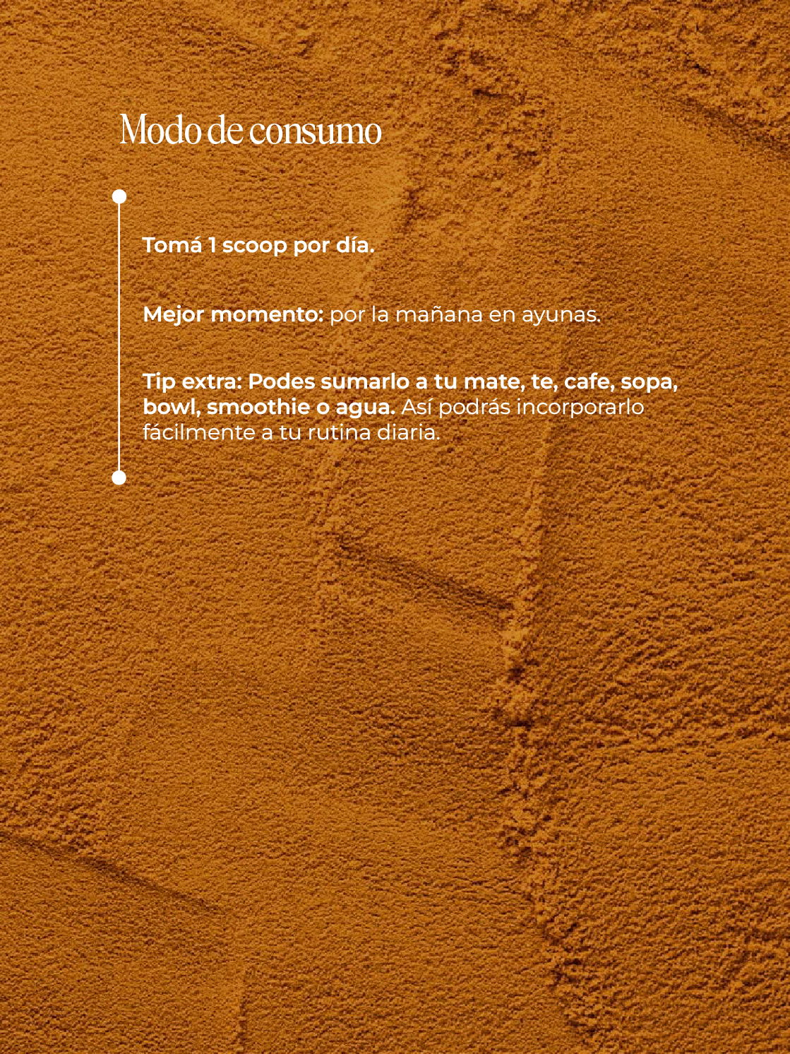 Tomá 1 scoop por día. Mejor momento: por la mañana, en ayunas, con un vaso de agua. Tip extra: combinalo con una pizca de sal marina para optimizar la absorción, también podés sumarlo a tu smoothie o infusión.