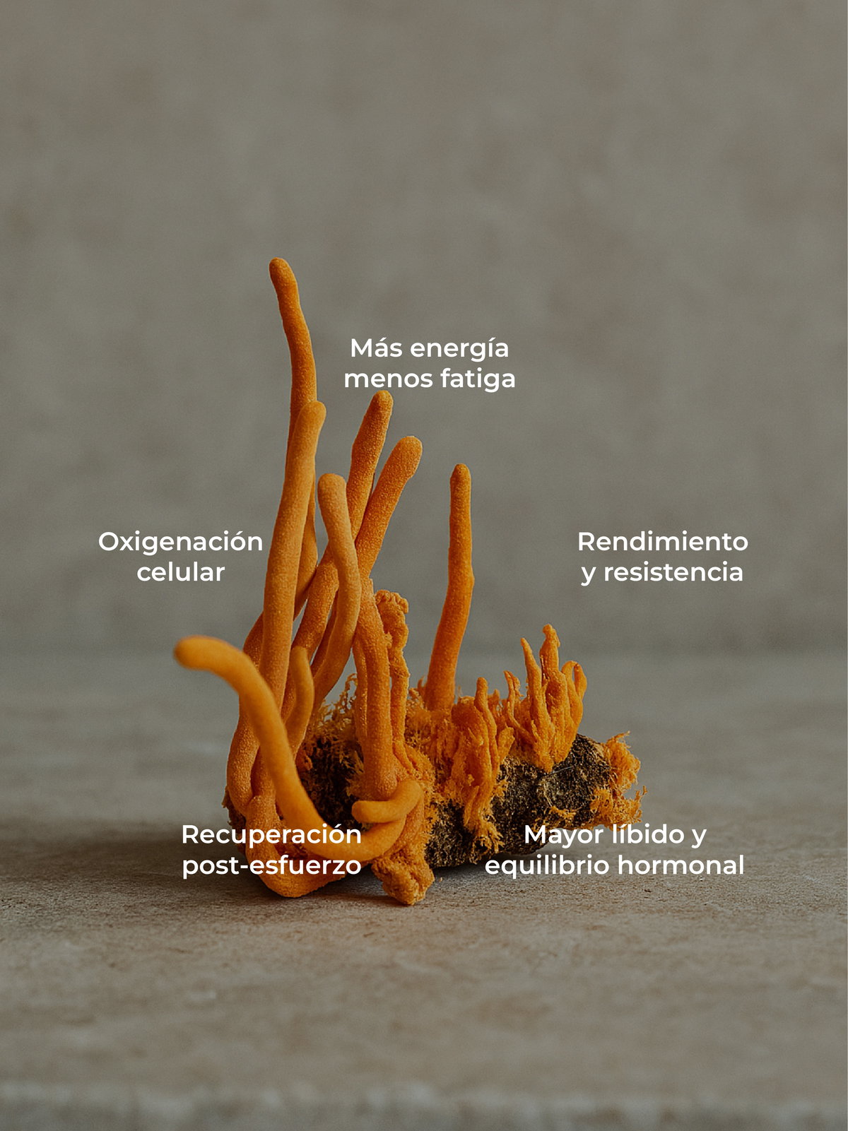 - Cordyceps: Mejora el uso celular del oxígeno y estimula la producción de ATP, la molécula energética clave. Aporta resistencia física, vitalidad y acompaña la recuperación post-esfuerzo. Es un soporte ideal para el rendimiento diario o en entrenamientos sin depender de estimulantes.